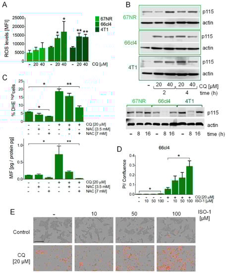 We evaluated ROS production in response to the inhibition of autophagy and found increased levels of ROS after CQ treatment in the 66cl4 and 4T1 cell lines (Figure 3A). Also, CQ treatment increased Uso1/p115 protein levels (Figure 3B) at early timepoints (2 or 4 h) and decreased in the 66cl4 and 4T1 cell lines at 8 h (Figure 3B), probably suggesting p115 secretion with MIF in the latter cell lines and a differential involvement of ROS and p115 in the three different cell lines studied. Importantly, ROS inhibition with N-acetylcysteine (NAC) treatment in the 66cl4 cell line (Figure 3C) decreased the secretion of MIF to the culture medium (Figure 3C), and treatment with ISO-1, a MIF inhibitor [], increased cell death in the 66cl4 cell line treated with CQ (Figure 3D,E) but not in the 67NR or 4T1 cell lines (Supplementary Figure S2C), indicating that MIF secretion induced by the inhibition of autophagy in the 66cl4 cell line has an important autocrine effect on cell survival.