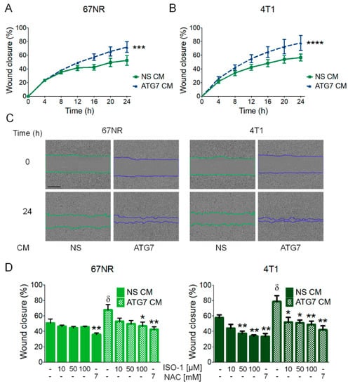 MIF secretion induced by the inhibition of autophagy paracrinally induced cell migration in autophagy-proficient breast cancer cell lines. Conditioned medium (CM) collected from 66cl4 cells transduced with a non-silencing (NS CM) or ATG7 (ATG7 CM) shRNA, was added to wild type 67NR or 4T1 cells for migration evaluation in a scratch-wound assay (A,B). Representative images of 67NR or 4T1 cells treated with 66cl4 CM are shown; the scale bar in the pictures represents 400 µm (C). Increased migration in 67NR or 4T1 cells induced by ATG7 CM from 66cl4 cells was decreased when 66cl4 ATG7 shRNA-expressing cells were treated with an antioxidant (NAC) during CM collection or when an MIF inhibitor (ISO-1) was added to the CM at the indicated concentrations (D). Graphs show wound closure area covered by the migrating cells at the indicated times or at 24 h. Graphs show mean +/− standard error of three to four independent experiments, * p < 0.05, ** p < 0.01, *** p < 0.001, ****p < 0.0001. In (D), δ: different from NS CM untreated control, *: different from their respective untreated control.