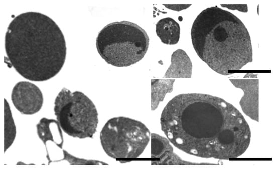 As a final phase of apoptotic death, the cell divides into a variable number of apoptotic bodies. These are a peculiar family of extracellular vesicles, quite variable in size and content [], (Figure 3).