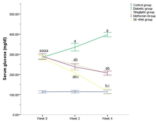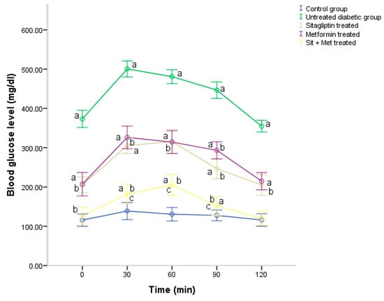 | Sitagliptin | 119.10 ± 9.68 abc | 71.70 ± 6.44 ab | 516.90 ± 16.96 |