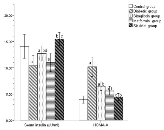 | Sitagliptin | 262.22 ± 13.68 a | 282.25 ± 10.58 ab | 318.66 ± 8.97 ab | 0.713 ± 0.411 abd | 0.22 ± 0.017 abd |