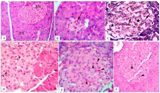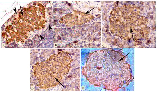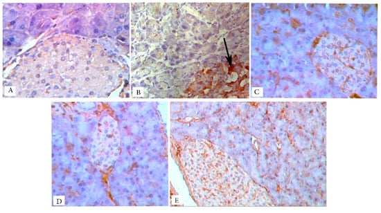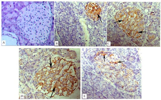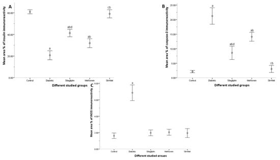- Immunohistochemical techniques, using the peroxidase-labeled streptavidin-biotin method, according to previously demonstrated protocols [23].Immunohistochemical staining was applied for the detection of insulin antibody (INS05 (2D11-H5)). The primary antibody used was mouse monoclonal insulin antibody (Labvision Corporation, Fremont, CA, USA). It was supplied at a dilution of 0.5–1.0 µg/mL and incubated with the slides for one hour at room temperature.Immunohistochemical staining for the detection of the caspase-3 antibody as a marker of apoptosis. The primary antibody used was rabbit polyclonal caspase-3 antibody (Labvision Corporation, Fremont, CA, USA). It was supplied at a dilution of 1:100 and incubated with the slides for one hour at room temperature.Immunohistochemical staining for the detection of inducible nitric oxide synthase (iNOS) antibody as a marker of inflammation. The primary antibody used was rabbit polyclonal iNOS antibody (Labvision Corporation, Fremont, CA, USA). It was supplied at a dilution of 1 µg/mL and incubated with the slides for one hour at room temperature.