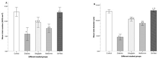 - Assessment of the islet number and islet size: For each study group, the islets were counted, and islet size was evaluated in 10 different, randomly selected microscopic fields, using lower magnification. Then, the mean islet number per field and mean islet size were calculated for each group of animals. The number of islets was expressed as N/10 mm2 of the pancreatic parenchyma, according to Noor et al. [24]. For the islet size, the maximum diameter of the islet was selected by comparing all possible radii diameters per islet and choosing the greatest according to previous work [4].