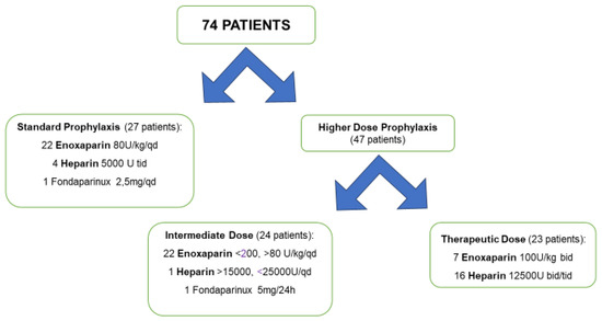 | Standard Antithrombotic Prophylaxis (27 Patients) | Higher Dose Antithrombotic Prophylaxis (47 Patients) | ODD Ratio | p-Value | |