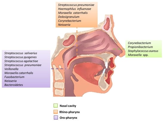 The rhino-pharyngeal microbiome ripples from the beginning of life onwards. Initially, there is a predominance of species belonging to the genera Moraxella, Corynebacterium, Dolosigranulum, Streptococcus or Staphylococcus spp. and possibly related to the mode of delivery (during caesarean section microbiome: Staphylococcus and Corynebacterium spp. and the microbiome during vaginal delivery: Staphylococcus, Streptococcus and Dolosigranulum spp.), and the type of diet. Later, in adults, there is a clear absence of Moraxella. The species that colonize the rhino-pharynx overlap with species from nearby anatomical areas such as the oropharynx (Streptococcus spp) and the anterior roots (mainly aerobic Gram-positive such as Staphylococcus, Dolosigranulum, Corynebacterium) [7,10,11]. The Gram-negative anaerobes are the same found mainly in the oropharynx and oral cavity, such as Prevotella and Veillonella spp mainly in the rhino-pharynx of young children. The rhino-pharyngeal microbiome plays an important and beneficial role in maintaining the balance of related species, preventing the growth of pathogens and host immunity [18,19,20,21].