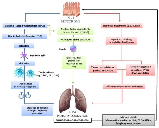 Bidirectional hypothesis that the intestinal microbiota can modulate the immunological activity of the lung: lipopolysaccharides (LPSs) are able to bind to the Toll-Like Receptor (TLR) present on the intestinal mucosa causing the activation of dendritic cells that favor the activation of various T cells (T-reg, T-h17, Th-1, CD4); subsequently, there is the acquisition of horning receptors (CCR6, CCR9, CCR4, a4b7) and migration to the lung through the circulatory lymphatic flow (CCR4/6Treg, CCR4/6Th17, CCR4/6Th1, CCR4/6CD4 +). It also activates (IL-18, INF-y, TNF-a, TGF-b, IL-4, IL-1), which will pass into the circulation (INF-y, TNF-a, IL-6). The nuclear factor kappa-light chain enhancer of (NFkB) activates IL-6, IL-10 and the production of IgA and IgG plasma cell b cells and the migration of IgG to the lung. In the lung, we have the increase in CCL17, CCL20 and the presence of CCR4/6, CD4 +, CCR4/6 and Th17. The migration of bacterial metabolites (e.g., short-chain fatty acids (SCFAs) to the lung through the bloodstream results in the down-regulation of pattern recognition receptors (PRR) with a consequent reduction in the production of inflammatory cytokines (IL-1, IL-12, IL-18), tumor necrosis factor alpha (TNF-α), interferon gamma (IFNγ) and granulocyte–macrophage colony stimulating factor (GM-CSF). In turn, the lungs send inflammation mediators and lymphocytes to the gut in case of disease.