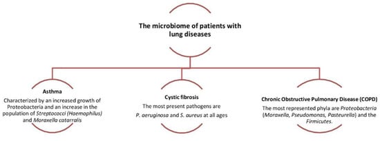 In this study, we researched the current clinical microbiology knowledge about the microbiota and the various lung diseases relationships, previously only indirectly related to microbial pathogenesis, and the microbiota–pathogenesis relationship of lung infection, among the main causes of diseases, in order to prevent and help in a targeted treatment of various lung diseases. In fact, the respiratory system microbiome (Nasopharyngeal, Tracheobronchial, and Pulmonary districts) is characterized by the presence of bacteria, fungi and viruses that in normal healthy subjects presents a low density and a high diversity of bacterial colonies, unlike what is observed in pathological conditions (infections, asthma, chronic obstructive pulmonary disease (COPD), cystic fibrosis, etc.) in which an increase in certain germs and the reduction in others occurs. The lungs are directly exposed to the external environment, and exposure to microorganisms, allergens, pollutants and other things, can alter the composition of the microbiota. Respiratory diseases (congenital or not) can then alter the balance of immigration and elimination since the inhaled germs find a more favorable habitat in the lung for their development but also a reduced effectiveness of the factors that help their elimination [4,5]. Pulmonary diseases can then cause dysbiosis in the microbiota (in which an increase in certain germs and a reduction in others are observed) and consequently an ineffectiveness of the mechanisms of elimination of germs (cough, muco-ciliary clearance). Furthermore, they can cause alterations of the structure of the airways (bronchi, bronchioles, alveoli) and thus changes in the viscosity of the mucus, in the pH, and in O2 tension, hence the alteration of ventilation and perfusion in the alveolar–capillary membrane. These modifications in turn facilitate the formation of niches that favor the growth and increase of common commensal bacteria. In addition, the interaction between the intestine and the lungs plays an important role in pulmonary microbiome eubiosis and immunomodulation [8,9,10]. It then becomes important to investigate the role of: (a) pathogenic microbes that cause or contribute to disease development and/or progression, (b) commensal microbes that do not cause disease, (c) neutral or beneficial host interaction bacterial microbiota studies, (d) the recent reassessment of viruses and fungi [11,12,13].