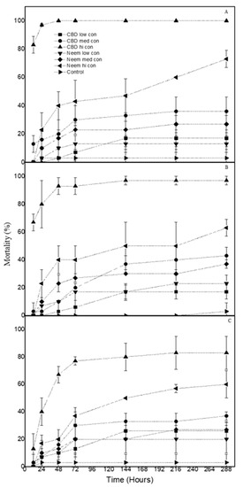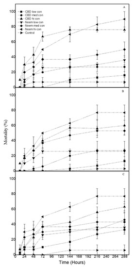 Essential oils have been successfully used to manage a rather wide number of serious insect pests [39,40]. The present study has highlighted substantial insecticidal activity of CBD oil and neem oil against T. confusum, O. surinamensis and P. interpunctella larvae and pupae, as high as 100% at the highest dose (90 mg/mL), whereby the overall survival time of the tested larvae was also considerably shorter than that of control larvae.