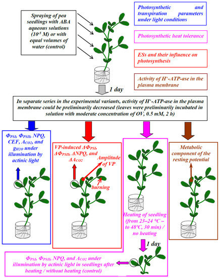 Schemes of different variants of experiments which were used in the current work. Fourteen to 21-day-old pea seedlings were investigated. There were four experimental variants, including an analysis of the exogenous abscisic acid (ABA) influence on (i) photosynthetic parameters under illumination by the blue actinic light (460 nm, 239 µmol m−2s−1); (ii) photosynthetic heat tolerance; (iii) changes in photosynthetic parameters and electrical activity, induced by local burning; (iv) the metabolic component of the resting potential, which was related to the activity of H+-ATP-ase in the plasma membrane. In separate series of the experimental variants, the activity of H+-ATP-ase in the plasma membrane could be preliminarily decreased (leaves were preliminarily incubated in water solution with a moderate concentration of sodium orthovanadate ((OV), 0.5 mM, 2 h); this treatment was used for imitating the influence of exogenous ABA and for the modification of ABA-induced photosynthetic changes. Measurement of the metabolic component of the resting potential was based on fast inactivation of the H+-ATP-ase (minutes) under the action of the high concentration of OV (5 mM); OV was added into solution, which was placed in contact with investigated plant cells, and changes in electrical potential were measured. Local burning of the first mature leaf was induced by a flame (3–4 s, about 1 cm2) [42,43,47,50,53,55]; we did not analyze parameters of propagation of burning-induced electrical signals (variation potential, VP) in detail. Photosynthetic ACO2 was calculated as the difference between the CO2 assimilation rate before the termination of illumination by the actinic light (after 10 min of illumination) and this rate 5 min after the termination (after 5 min of dark conditions).