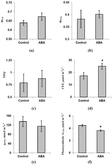 The analysis of the influence of the exogenous ABA treatment (spraying) on photosynthetic processes under light conditions showed that the investigated parameters of the light reactions (ΦPSI, ΦPSII, and NPQ) in pea leaves were not affected by this treatment (Figure 2). Only a weak and insignificant increase in ΦPSI was observed in treated pea seedlings. In contrast, CEF was significantly increased after the ABA treatment; the relative magnitude of the increase was about 47%. Significant changes in gH2O were absent. Photosynthetic ACO2 was significantly decreased after the ABA treatment; the relative magnitude of this decrease was about 20%. It was interesting that the magnitudes of changes in CEF and ACO2 were negatively related (R = −0.70, p < 0.05). The results were in good accordance with our previous data [33], which showed an ABA-induced decrease in CO2 assimilation and increase in CEF; however, changes in ΦPSI, ΦPSII, and gH2O were absent.