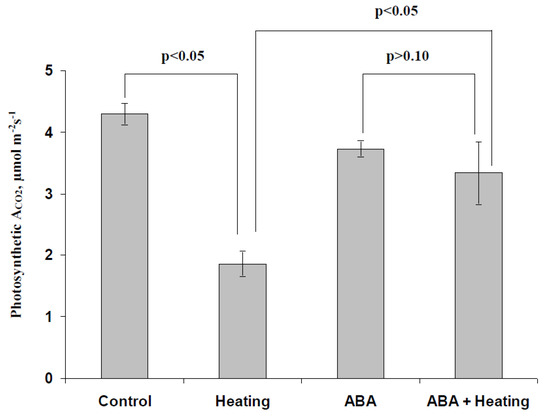 Influence of the ABA treatment on the photosynthetic assimilation of CO2 (ACO2) after heating in pea seedlings (n = 5–15). The ABA treatment of seedlings was performed by spraying them with aqueous solutions (10−5 M) 1 day before heating; plants without the ABA treatment were treated with equal volumes of water. Seedlings were heated from between 23 and 24 °C to 48 °C for 30 min using a thermostat. The photosynthetic CO2 assimilation was measured after 10 min of illumination by blue actinic light (239 µmol m−2s−1); photosynthetic measurements were performed 1 day after heating in the second mature leaf.