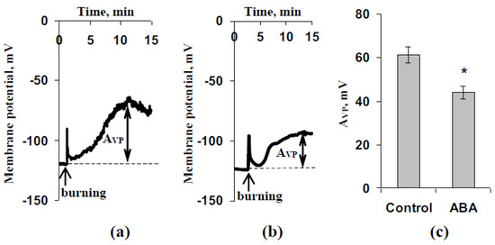 Figure 4 shows typical electrical signals, which were observed in plants after the ABA treatment and without this treatment. The signal was measured in the mesophyll cell in the second mature leaf of pea seedlings after local burning of the first leaf. The electrical signal had a long duration (more than 10 min) and complex dynamics of changes in the membrane potential (including a fast depolarization spike and slow, long-lasting depolarization after that), i.e., it can be classified as VP [37,83,84]. The average amplitude of VP without the exogenous ABA treatment was about 60 mV (Figure 4c). The ABA treatment 1 day before the measurements of electrical activity significantly decreased the amplitude of VP (from 60 mV to about 44 mV). Therefore, the relative decrease in amplitude VP in the second pea leaf after the ABA treatment was about 28%. VPs were also measured by using extracellular electrical measurements (Supplementary Materials, Figure S1); these measurements supported the significant decrease in the VP amplitude after the ABA treatment.