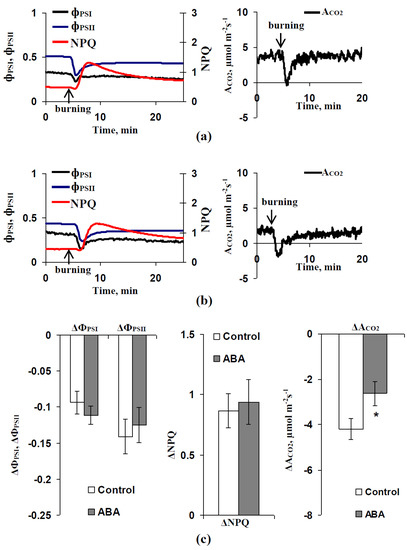 Figure 5c shows the average magnitudes of these changes in pea leaves in seedlings, which were treated by the exogenous ABA and were not treated. It was shown that the ABA treatment weakly influenced the magnitudes of the local burning-induced decrease in ΦPSI and ΦPSII and increase in NPQ; all differences between changes in these parameters of photosynthetic light reactions in treated and untreated plants were insignificant. In contrast, the magnitude of the local burning-induced suppression of ACO2 was significantly decreased after the ABA treatment (by approximately 37%).