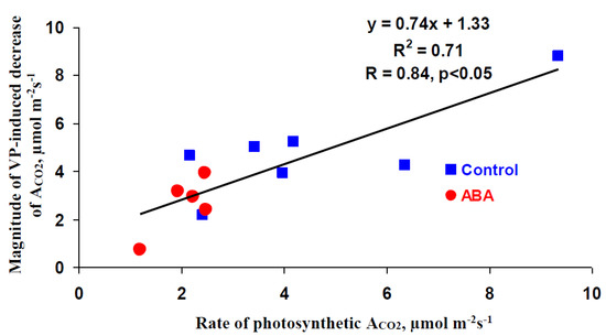 However, there is an alternative way of influencing the ABA treatment in the photosynthetic response induced by electrical signals. We showed that the ABA treatment decreases the VP amplitude (Figure 4c and Figure S1c), which is in good accordance with the dependence of VP generation on the H+-ATP-ase activity [37]. It is also known that that magnitude of the photosynthetic response is linearly related to the VP amplitude (see works [53,85] and Figure S1d, Supplementary Materials); as a result, the ABA treatment-induced decrease in the VP amplitude can decrease the photosynthetic response.