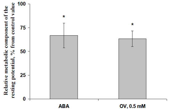 Figure 7 shows that the exogenous ABA treatment significantly decreased the metabolic component of the resting potential which was measured 1 day after the treatment; the magnitude of this decrease was about 33%. The result was in good accordance with our previous results [33], which showed that the ABA treatment decreased the metabolic component of the resting potential by 20–40%. It was very interesting that the preliminary treatment of the second pea leaves by a moderate concentration of OV (0.5 mM and 2 h of incubation, in accordance with our earlier work [68]) induced a similar decrease in the metabolic component; the magnitude of this decrease was about 37%. Considering the key role of the plasma membrane H+-ATP-ase in the formation of the metabolic component [81,82], the ABA treatment-induced decrease in the metabolic component showed a decrease in activity of this H+-ATP-ase.