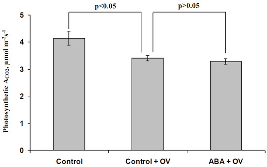 The next stage of the investigation was devoted to an analysis of the participation of the decrease in the H+-ATP-ase activity (using preliminary treatment of pea leaves with a moderate concentration of OV [33,68]) in the influence of the exogenous ABA treatment on the photosynthesis under light conditions, photosynthetic heat tolerance, and regulation by electrical signals. Considering the absence of a significant influence of the ABA treatment on the investigated parameters of photosynthetic light reactions in leaves (ΦPSI, ΦPSII, and NPQ) and significant relation between changes in CEF and ACO2, we only analyzed the CO2 assimilation in this part of the work.