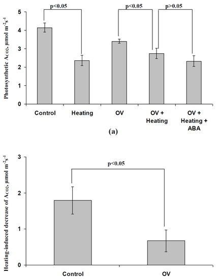 Figure 9 shows the participation of the decrease in the H+-ATP-ase activity in the ABA-induced increase in the photosynthetic heat tolerance. In particular, it was shown that the preliminary treatment with the moderate OV concentration significantly influenced the magnitude of the heating-induced decrease in photosynthetic CO2 assimilation (Figure 9b); the relative magnitude of this decrease after the OV treatment was only 37% of that without the OV treatment. Moreover, significant differences between the photosynthetic CO2 assimilation after heating in seedlings that were treated with the moderate OV concentration and seedlings that were treated with both the moderate OV concentration and exogenous ABA, were absent.