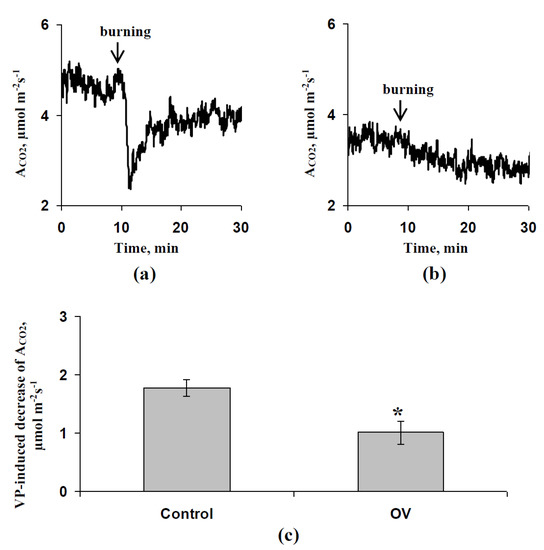 Influence of the modification of H+-ATP-ase activity by sodium orthovanadate (OV) on the local burning-induced decreases in CO2 assimilation. (a) Local burning-induced changes in ACO2 in the leaf of a control seedling. (b) Local burning-induced changes in ACO2 in the leaf of a seedling after vanadate treatment. (c) Average magnitudes of local burning-induced ACO2 decreases (n = 5–6). The preliminary OV treatment of the leaves of seedlings was performed by incubation of the leaf (2 h) in a solution of OV with a moderate concentration (0.5 mM); after that, this leaf was dried by filter paper and photosynthetic measurements were performed. Similar treatment by water was used in the control. Photosynthetic measurements were performed in the second mature leaf; illumination by blue actinic light (239 µmol m−2s−1) was used. Local burning of the first mature leaf by a flame (3–4 s, about 1 cm2) was performed 1.5 h after plant fixation for measurement. *, difference between experiment and control plants is significant (p < 0.05).