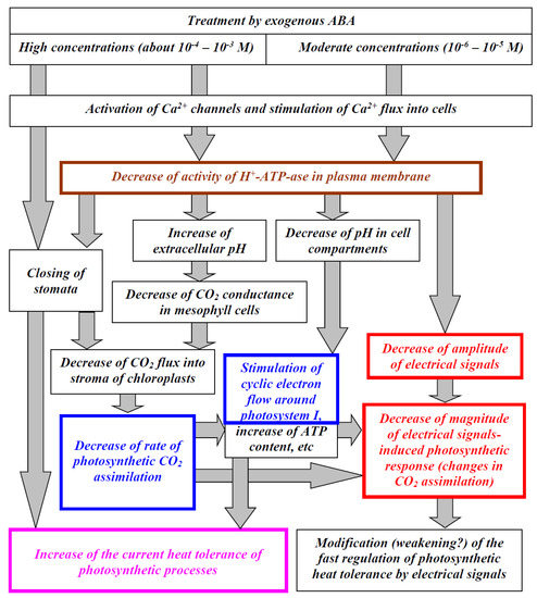 Considering our results and literature data, we proposed a hypothetical scheme of the potential modes of participation of H+-ATP-ase of the plasma membrane in the influence of spraying by exogenous ABA on the photosynthetic CO2 assimilation, heat tolerance of photosynthetic processes, and their regulation by electrical signals (Figure 11). In accordance with the scheme, spraying with high concentrations (10−3–10−4 M) of exogenous ABA can induce the closing of stomata and decrease the rate of photosynthetic CO2 assimilation [32,86]; this effect is probably caused by the activation of Ca2+ channels, which activate S-type anion channels [83]. However, this closing is probably to be weak under moderate concentrations of the exogenous ABA (10−6–10−5 M, see current work or works [33,90]). Alternatively, exogenous ABA treatment can decrease the activity of the H+-ATP-ase in the plasma membrane of leaf cells (see Figure 7 and [12,33,35]); it is probable that this effect is caused by Ca2+ influx into cells.