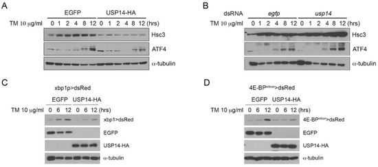 The following are available online at https://www.mdpi.com/2079-7737/9/10/332/s1, Figure S1: Quantitation of the normalized Hsc3 or ATF4 band intensity, Figure S2: Overexpression of USP14 decreased the levels of thapsigargin-induced ER stress, Figure S3: Knockdown efficiency of usp14 in Drosophila S2 cells, Figure S4: Kinetic measurement of proteasome activity, Figure S5: USP14 overexpression resulted in increased levels of Atg8a-II, Figure S6: Densitometric analyses and whole images of representative membranes for all the Western blots. Table S1: The summary of proteomic analysis, Table S2: Gene ontology (GO) analysis, Table S3: The lists on antibodies used in this study.