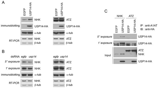 USP14 is known to contribute to the stability of cellular proteins by regulating proteasomal activity or its own activity. The allosteric regulation of the proteasome by USP14 is mediated by direct interactions with the ATPase ring in the proteasome, which interferes with the RPN11 function and inhibits the conformational change in the proteasome for proper substrate translocation [38]. In addition, USP14 is one of three proteasome-associated DUBs and promotes Ub recycling [39,40,41]. We tested the function of USP14 in the degradation of substrate proteins by examining NHK and ATZ expression. Overexpression of USP14 in S2 cells increased the expression of NHK but not that of ATZ. Conversely, USP14 knockdown resulted in reduced NHK expression (Figure 2). Given that USP14 interacts with NHK but not with ATZ, we assume that USP14 specifically recognizes its own substrate NHK, not ATZ, and thus stabilizes NHK through its enzymatic activity. Although these proteins are variants of A1AT, their fates and effects on cellular stress are different [10,23,42]. Thus, we hypothesize that the differential effect of USP14 on the ubiquitination of NHK and ATZ could be attributed to the structural features of the protein.