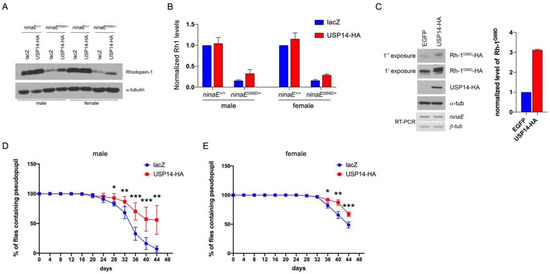 To further validate the role of USP14 in age-dependent disease progression, pseudopupil assay was performed. This assay is widely used to examine photoreceptor cell degeneration. The transgenic expression of GFP in the photoreceptors allows us to visualize the pseudopupil under fluorescent light. In male ninaEG69D/+ flies expressing a control protein lacZ, the pseudopupil progressively disappeared beginning on day 20, with only 7% of flies demonstrating an intact pseudopupil on day 44 after eclosion (Figure 3D, blue line). Significantly, the expression of USP14 in the ninaEG69D/+ background resulted in a delayed course of retinal degeneration with approximately 56% of the examined flies (p < 0.01) exhibiting pseudopupil on day 44 (Figure 3C, red line). A similar effect of USP14 on retinal degeneration was evident in female flies (Figure 3E), although the rate of retinal degeneration in females was delayed compared to that in males. In females, nearly 49% of the ninaEG69D/+ flies expressing lacZ lost the deep pseudopupil by day 44. The USP14-expressing ninaEG69D/+ flies demonstrated a delayed course of retinal degeneration with approximately 67% of flies exhibiting intact Rh1>GFP patterns (67.1 ± 4.079%, p < 0.001). We favor the interpretation that USP14 enhances the stability of both mutant Rh-1 and wild-type Rh-1, which helps traffic these proteins to rhabdomeres that harbor light-sensing organelles, which are equivalent to the outer segments of mammalian rod cells [26].
