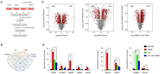 We turned our attention to the function of USP14 in the proteasomal dynamics during ER stress. The proteasome is a diverse, dynamic, and heterogeneous supramolecular complex. The proteomes and the function of the proteasome can dynamically change depending on cell or tissue type, subcellular localization, extracellular stimuli, and pathological context [27,28,29,30]. As proteasomes are highly conserved [29], to examine the proteasomal dynamics under conditions of ER stress, human proteasomes were affinity-purified from HEK293 cells expressing biotin-tagged human 4 subunits. We analyzed the composition of the proteasome subunits and associated proteins in cells with or without TM-induced ER stress using mass spectrometry-based label-free quantification (Figure 4A). In addition, we tested the effect of IU1, a potent inhibitor of USP14, on proteasomal reorganization in cells subjected to ER stress. In total, 2491 proteins (2190 in normal cells, 2266 in 293 cells treated with TM for 6 h, 2178 in 293 cells treated with IU1 for 10 h, and 2147 in 293 cells subjected to pre-treatment with IU1 for 10 h followed by 6 h of TM treatment) were identified (Supplementary Table S1). However, 135 proteins in total were identified at least once from each experimental condition (Figure 4B). According to our criteria (ratio ≥ 2, ≤0.5, and Benjamini‒Hochberg FDR ≤ 0.05), differentially associated proteins were analyzed between the two samples described in Figure 4C and Supplementary Table S1. A total of 703 proteins demonstrated a significant change in interactions with the proteasome following 6 h of TM treatment compared to before the treatment. Among them, we observed that the interactions of some E3-ubiquitin ligases and proteasome adaptors with the proteasome changed dynamically in response to ER stress (Figure 4C,D and Supplementary Table S1). Specifically, ubiquitinating enzymes such as ARIH2, MYCBP2, UBE3B, UBE4B, and RFN40, accumulated in the proteasome in response to ER stress (Figure 4D). In addition, deubiquitinases such as BRCC3 and USP24 also accumulated in the proteasome during the 6-h TM treatment (Figure 4D). In contrast, IU1 altered the interaction of proteins with the proteasome under conditions of ER stress (Figure 4C). While PSMB10 accumulated in the proteasome upon treatment with IU1, the amount of ECPAS associated with proteasome decreased significantly (Figure 4D). In addition, Gene Ontology (GO) analysis indicates that mitochondria and spliceosome related proteins dynamically interacted with the proteasome and the association of some ERAD components with proteasome changed under ER stress (Supplementary Table S2). Although the exact mechanism of association of these proteins with the proteasome under conditions of ER stress remains to be explored, we believe that the structure of the proteasome complex is dynamically altered in response to ER stress. This change helps the cells cope with ER stress by modulating the degradation of misfolded proteins via interaction with multiple proteins associated with protein degradation.