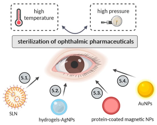 Several sterilizations methods of ophthalmic pharmaceuticals based on different types of nanoparticles (lipid-based, silver, magnetic or gold nanoparticles) are here described and summarized in Figure 3.