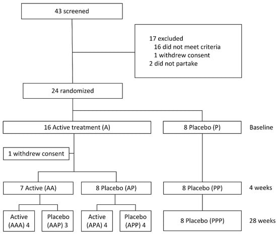 Twenty-four healthy volunteers were included in the study; their baseline characteristics can be found in Table 1. One subject withdrew consent after two weeks for non-study related reasons (Figure 1). This subject was randomized to the active-active-placebo treatment arm and was not replaced.