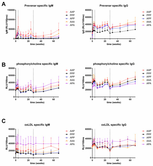 Autoantibodies against PC are also found in humans, where low levels of PC–IgM autoantibodies correlate with a higher incidence of cardiovascular disease [22,23,24,25]. Moreover, pneumococcal-specific IgG and oxLDL-specific antibody titers correlated significantly in subjects who had received pneumococcal vaccination [26], although there are also reports of an absent effect of pneumococcal vaccination on oxLDL–specific IgM levels [27].