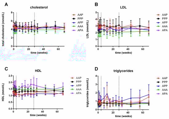 Cholesterol (A), LDL (low density lipoproteins) (B), HDL (high density lipoproteins) (C) and triglycerides plasma levels (D) (mean + SD). n = 4 per group, n = 3 for AAP group and n = 8 for PPP group. ‘A’: active treatment, ‘P’: placebo treatment. Dotted lines indicate vaccinations (baseline, 4 weeks, 28 weeks). Statistical analysis using a mixed model analysis of variance with fixed factors: treatment group and time, and the interaction of treatment group and subject as random factor. No significant differences were found, with the exception of APP versus PPP for triglycerides (p = 0.009).