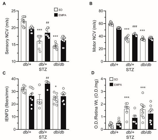 EMPA ameliorates neuropathy and retinopathy in T1D but not T2D mouse models. (A–D) Terminal sensory nerve conduction velocity (NCV) (A), motor NCV (B), intraepidermal nerve fiber density (IENFD) (C), and terminal retinal apoptosis (D) in T1D (db/+ STZ), T2D (db/db), and control (db/+) mice with/without EMPA; n = 4–10 mice per group; * p < 0.05, *** p < 0.001 for untreated control vs. untreated T1D or T2D; ## p < 0.01, ### p < 0.001 for untreated vs. treated T1D; by one-way ANOVA. Data are expressed as the mean ± s.e.m.
