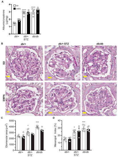 EMPA does not improve nephropathy in T1D and T2D mouse models. (A–D) Albumin-to-creatinine ratio (ACR) (A), representative examples of glomerular periodic acid-Schiff (PAS) staining (B), glomerular area (C), and mesangial index (D) in T1D (db/+ STZ), T2D (db/db), and control (db/+) mice with/without EMPA; n = 4–10 mice per group; * p < 0.05, *** p < 0.001, **** p < 0.0001 for untreated control vs. untreated T1D and T2D; by one-way ANOVA. Data are expressed as the mean ± s.e.m.