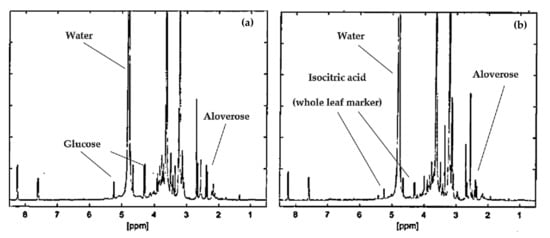 The 1H-NMR spectra for the gel and whole leaf materials are shown in Figure 1a,b, respectively. The content of marker molecules in the Aloe muth-muth gel and whole leaf materials obtained from quantitative 1H-NMR are shown in Table 1.