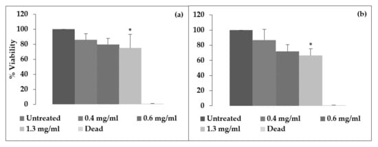 Percentage cell viability of immortalized human keratinocyte (HaCaT) cells after 48 h exposure to Aloe muth-muth gel (a) and Aloe muth-muth whole leaf (b) plant material. The data were normalized to the untreated control that is considered as 100% viable. The * indicates statistical significance in comparison to the untreated control (Bonferroni test, p < 0.05).