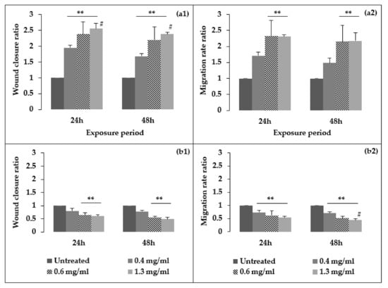 Ratio of percentage wound closure (1) and wound closure rate (2) results after exposure to (a) Aloe muth-muth gel and (b) Aloe muth-muth whole leaf at 24 h and 48 h treatment periods. Each data point was calculated with respect to the relevant initial wound value at time 0 h and normalized to the untreated control, which was considered as 1. The ** and # indicate statistical significance determined with Tukey’s honest significant difference (HSD) and Kruskal–Wallis tests, respectively, in comparison to the untreated control (significance accepted when p < 0.05).