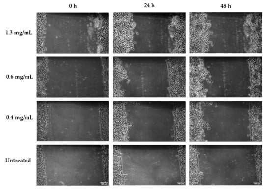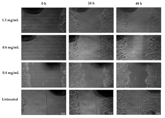 Microscopic photos of wound gaps in HaCaT cells introduced by the scratch technique after treatment with Aloe muth-muth whole leaf material at 1.3 mg/mL, 0.6 mg/mL, and 0.4 mg/mL, compared to an untreated control, at 0 h, 24 h, and 48 h. Images were captured at 10× magnification and the scale bars indicate 100 µm.