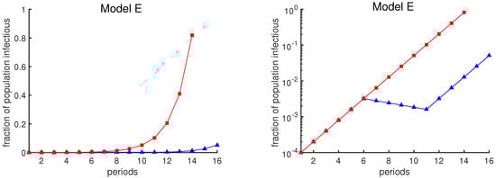 Fraction of the population that is infectious using Model E. Both curves show the fraction of the population that is infectious. One period is the average time interval between successive infection generations. The red curve assumes a contact rate of . The blue curve illustrates the effect of an intervention, undertaken between periods 6 and 11, that temporarily reduces the contact rate below 1. The same data are plotted in both panels; the vertical axis is a linear scale on the left and a logarithmic scale on the right.