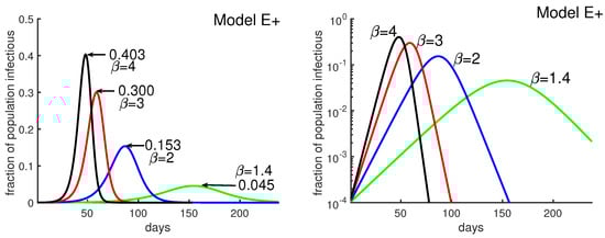 Figure 3 was obtained by running four different simulations of Model E+ for contact rate . It shows how the outbreak’s peak depends upon the contact rate. The figure illustrates that a higher contact rate causes a more severe outbreak with a higher and earlier peak. Figure 3 also explains how to produce the outbreak daily using Model E+.