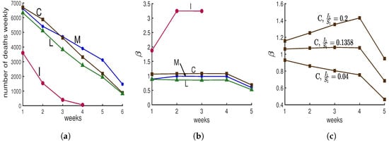 Four simulations from The New York Times. Panel (a) Following the beginning of the lockdown in New York City, The New York Times [] reported on four simulations of deaths with projections for 4 to 6 weeks, shown here with weekly totals. The simulations included large uncertainty intervals that are not shown here. Write Dn for deaths in week n. Panel (b) Contact rates βn. We assume that deaths are a constant fraction of actual cases, so Dn+1/Dn = In+1/In. Hence, if one has the initial fraction, I1, of susceptibles who are infectious and the contact rates βn, then Model E+ will exactly reproduce the curves in panel (a). See the text for a description of the computation of β and the values for I1s. Panel (c) Here three different choices for ratio I1/S1, for the case “C” are represented. As the figure represents only when I1/S1 = 0.1358, the contact rate β will be constant during the middle of the run.