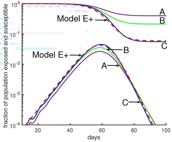 Figure 5 shows outbreaks from our Model J (Equation (12)). We draw the reader’s attention to the fact that there is more variation between the three Model J curves than there is between their average and the Model E+ curve. We suggest that it is quite difficult to determine which of the three Model J simulations best represents reality. Uncertainty in produces uncertainty in the epidemic peak and in the total number infected during the outbreak. See Figure 3. Though not shown in our figures, the response of Model J to changes in is quite similar to Model E+’s. However, J has additional uncertainties due to its extra transmission parameters, as is shown in Figure 5 and Figure 6.