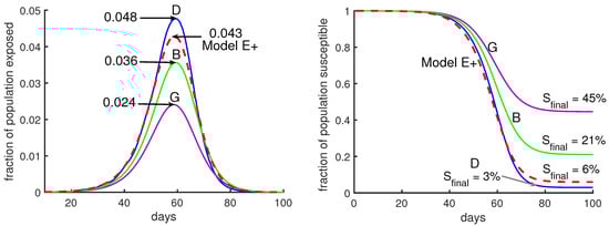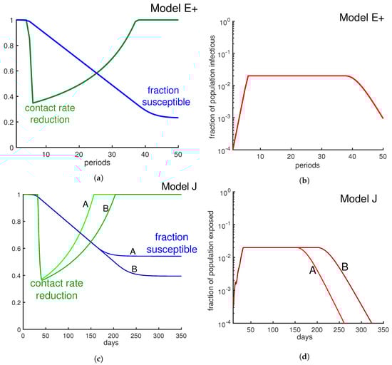 In Figure 9d by using Equation (15) we keep the total exposed under weekly. To make Model E+, which has a time step of 7 days, comparable with Model J, which has a time step of one day, we plot the exposures per week for both models. Note that for Model E+ exposures in week n equals the infectious in week . As Figure 9d illustrates, depending on the set of chosen parameters, that the desired result can be achievable in shorter (case A) or longer (case B) time. When facing a pandemic, there are lots of uncertainties in the choice of parameters. Choosing the wrong parameters means obtaining an incorrect prediction. Reporting all possible predictions from all possible choices results in a very uncertain prediction.