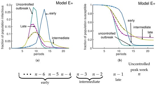 We investigate the effect of a 6-week intervention during which the effective contact rate is reduced from 3 to 1.6. Such interventions in an influenza epidemic can delay the growth of the epidemic []. Our simulations show this delay for an early intervention. By an “early intervention” we mean an intervention implemented more than three weeks before the uncontrolled outbreak would peak. Our simulations suggest that an early intervention only delays the epidemic (blue curves in Figure 7a,b). A late intervention is being implemented one week before the uncontrolled outbreak peaks. A late intervention will not have a large impact on reducing the peak, but it will decrease cases after the peak and therefore will increase slightly; (see the purple curves in Figure 7a,b). According to our simulations, a policy I type intervention has an optimum impact on reducing the severity of an outbreak if it starts either two or three weeks before the uncontrolled outbreak peaks. An intervention which starts two to three weeks before uncontrolled outbreak peaks is called an intermediate intervention. For Model E+ when , the uncontrolled outbreak peaks at week 12, with a and . An intermediate intervention can reduce the peak by and the fraction of people who do not experience the disease will increase by more than . (Golden curves in Figure 7a,b).