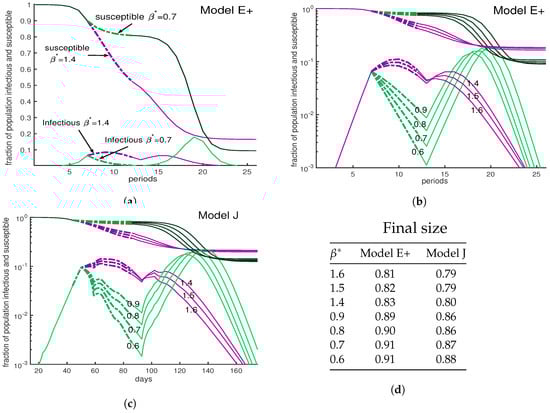 A severe intervention is more likely than a mild intervention to be followed by a large peak. Outside the intervention period, β = 3. During intervention the contact rate is shown by β∗. The curves are dashed during the intervention period. (a) This figure compares a mild intervention with a strong intervention using Model E+. The uncontrolled outbreak with no intervention (not shown) has a peak about 28% and Sfinal ∼6%; i.e., 94% of the population is infected during the entire outbreak. Mild intervention, β∗ = 1.6, raises Sfinal to ∼25%. The severe intervention raises the Sfinal to ∼18%. (b,c). We show an outbreak with a 6-week intervention with a variety of contact rates for both Model E+ (panel b) and Model J (panel c). The intervention period begins when the susceptible population S(d) is ≈ 0.9. The vertical axis is showing the fraction of the population susceptible (upper curves) in week n for Model E+ or in day d for Model J. The lower curves are In for Model E+ and Infec(d) for Model J. Mild interventions (magenta) reduce β to 1.4 to 1.6 and severe ones (green) reduce β to 0.6 to 0.9. Model J changes β by changing Jβ using Equation (13). For Model J, exposed individuals are infectious on days 7 through 12 and they are equally infectious. (d) The final sizes are shown for both Model E+ and Model J. The final size is the total fraction infected during the entire outbreak. According to the table in (d), the strong intervention results in more infected cases during the entire outbreak than the mild one.