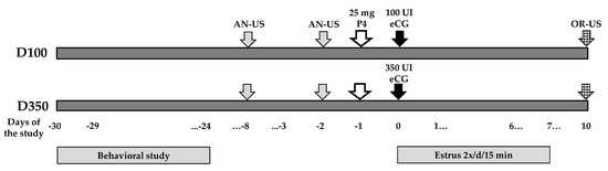 Thereafter, in the middle of March, all goats received one intramuscular dose of 25 mg of progesterone (Progesvit®, Brovel, Mexico). One day later, while the D100 group (n = 35) received 100 IU of equine chorionic gonadotropin (eCG) per female (Folligon®, Intervet, Mexico), in a simultaneous fashion, the D350 group received 350 IU of eCG per female. Progesterone and eCG were applied intramuscularly; the LSR, MSR, and HSR were randomly located in each eCG dose group. Subsequently, the estrus behavior was tested twice per day (09:00 and 17:00 h) for 15 min, from the day of eCG application, till day 7 of the experimental period (Figure 1). Estrus behavior was defined with the use of 7 sexually active males; in order to prevent sexual intercourse, each buck was aproned. Previously, bucks were subjected to a testosterone hormonal treatment in order to re-activate their sexual behavior and ensure libido [33]. If the female goat remained steady and allowed herself to be mounted by the teaser-buck, estrus commencement was ruled. Afterwards, the male’s apron was detached and the goats from both experimental groups were then exposed to natural mount during the first 12 h after the onset of the estrus. The estrus induction percentage was defined as (number of estrus females/total treated females) × 100. The duration of the estrus was considered the interval between the first and the last mount allowed per goat, additionally, ovulation rate was defined as (total corpus luteum per ovulating goat within group/total goats ovulating within group) × 100.