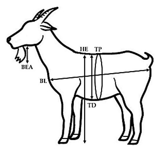 Morphological variables evaluated and their body reference points: TP: thoracic perimeter, cm; TD: thoracic diameter cm; BL: body length, cm; HW: height at withers, cm; BEA: length of beard, cm, in crossbred (Alpine-Saanen-Nubian x Criollo; n = 70) dairy goats managed under intensive, stall fed conditions in Northern Mexico (March, 25° North). Data concerning the linear and morphometric measures were collected and elaborated in all goats (n = 70); two morphometric indices were calculated: the compactness index COM = [live weight/height at withers] × 100, and the anamorphosis index ANA = (thoracic perimeter)2/height at withers).