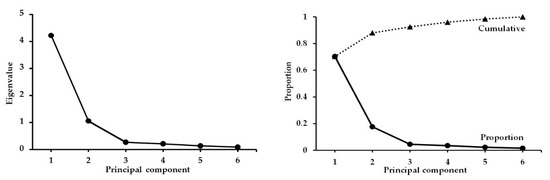 Each eigenvector was calculated from an eigenvalue of the correlation matrix of the morphometric values, where the eigenvalues are related to the variance of each PC. That is, the eigenvectors of a correlation matrix determine the direction of the observed variance in a data set; the eigenvector with the highest eigenvalue, that is, the magnitude of the variance, is therefore the PC. The eigenvalues and percentages of the explained variance and cumulative variance for the six principal components based in the morphometric traits are presented in Figure 3. The main outcomes show that the first two PC accounted for 88.01% of the total variance; the remaining four PC explained 11.9% to the total variance.