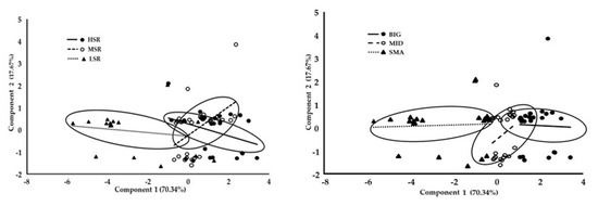 Principal component analysis performed on the morphometric variables in goats; plots represent the first two principle components, considering the scores of the morphological characters representing the morphospace, according to social ranks (i.e., high, HSR; medium, MSR; low, LSR) (Left panel) as well as according to body size (i.e., big, BIG; medium, MID; small, SMA) (Right panel). Both panels are based on the eigenvectors and eigenvalues generated from the correlation matrix among the morphometric values measured from crossbred dairy goats managed under intensive conditions (n = 70). Note: More details were previously described in the main body of the text.