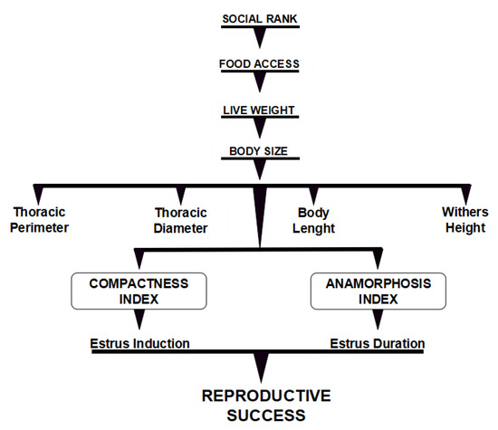 Conceptual diagram modeling the main relationships among social rank, food access, live weight, body size, morphometric values, morphologic indexes, estrus induction, estrus duration, and reproductive success in crossbred (Alpine-Saanen-Nubian × Criollo; n = 70) anestrous dairy goats managed under intensive stall fed conditions in Northern Mexico (March, 25° North).