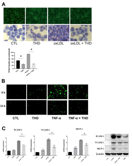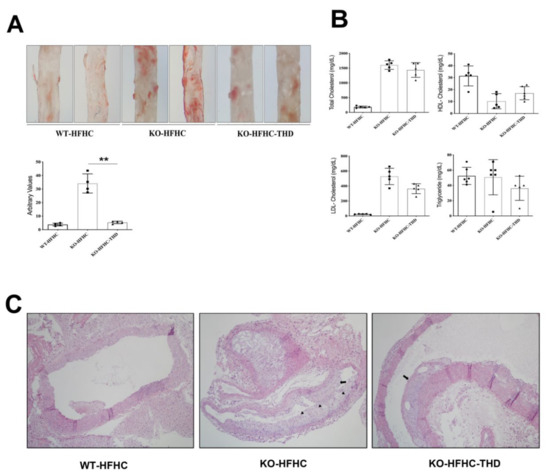 3.2. Reduction of Atherogenic Plaque Formation with THD Treatment in ApoE-/- Mice